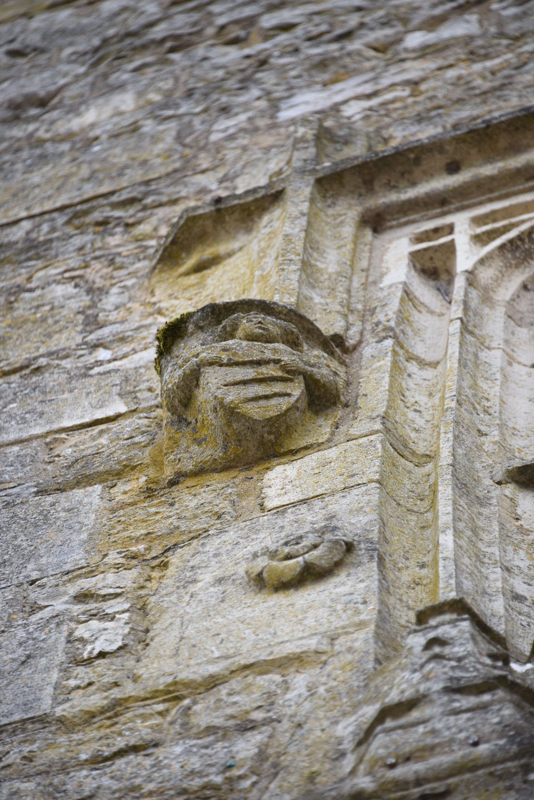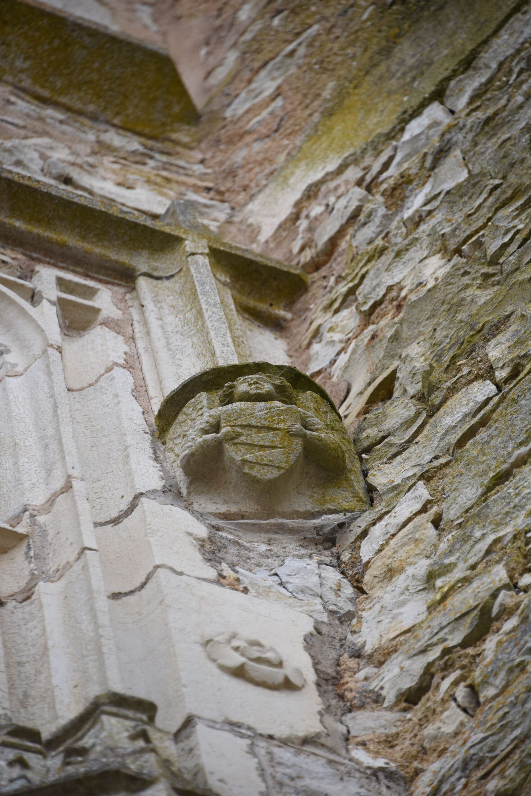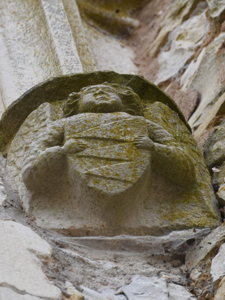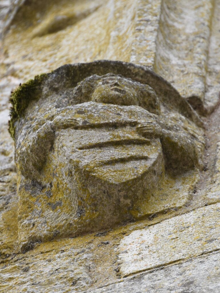 La fenêtre à traverse et meneau, richement moulurée, à bases prismatiques, et ornée de fleurs sur les deux côtés, est surmontée d’un cordon, qui prend appui sur deux consoles, sculptées de deux anges. Chacun d’eux brandit sur sa poitrine un écu armorié, sur lequel se distingue un motif en dent de scie (armoiries 1a-1b).