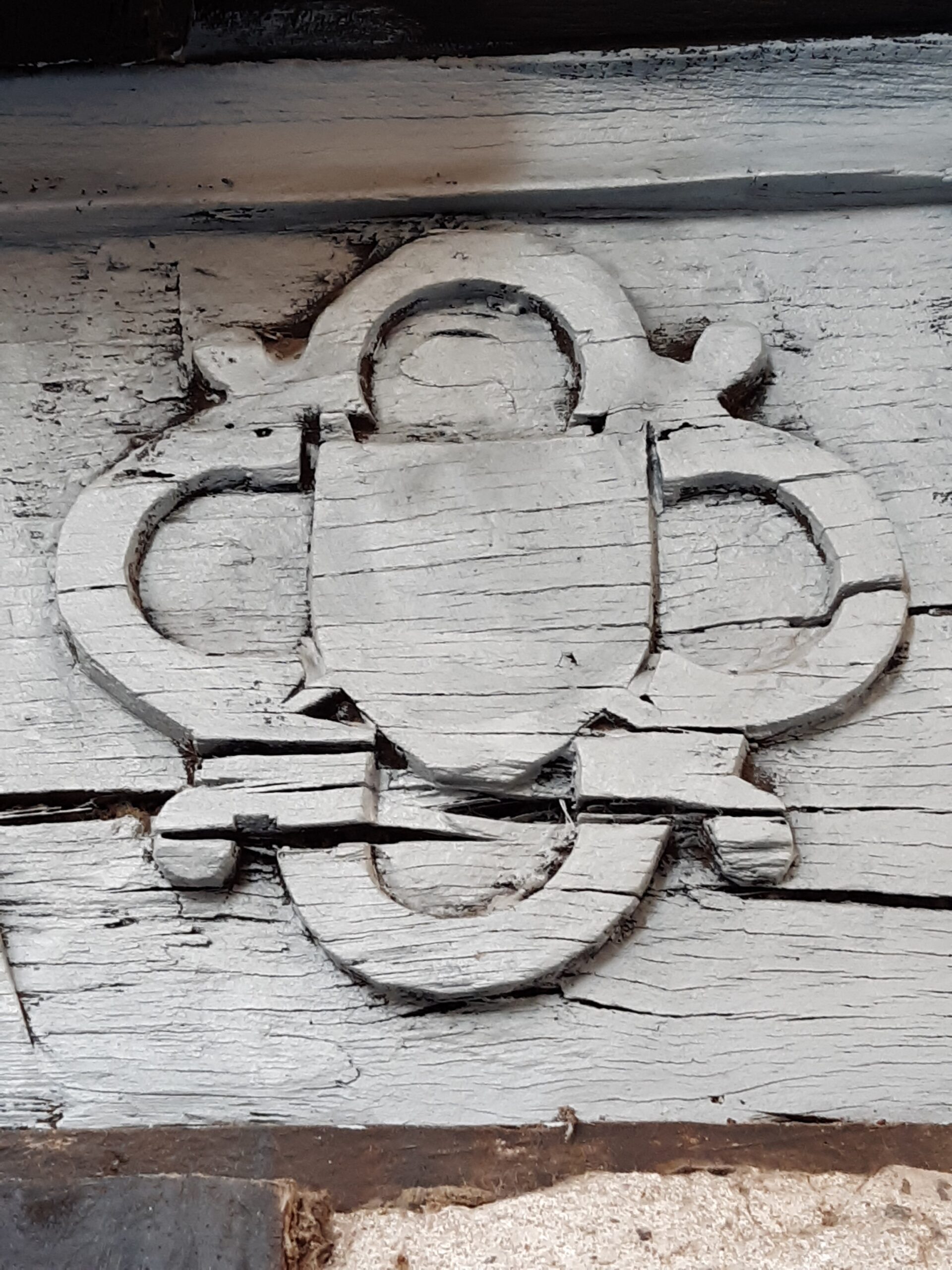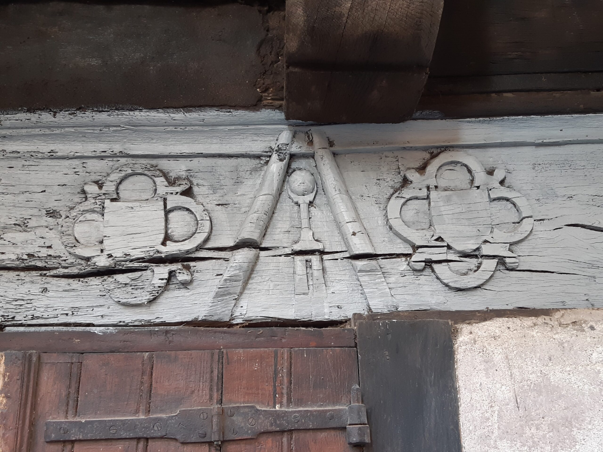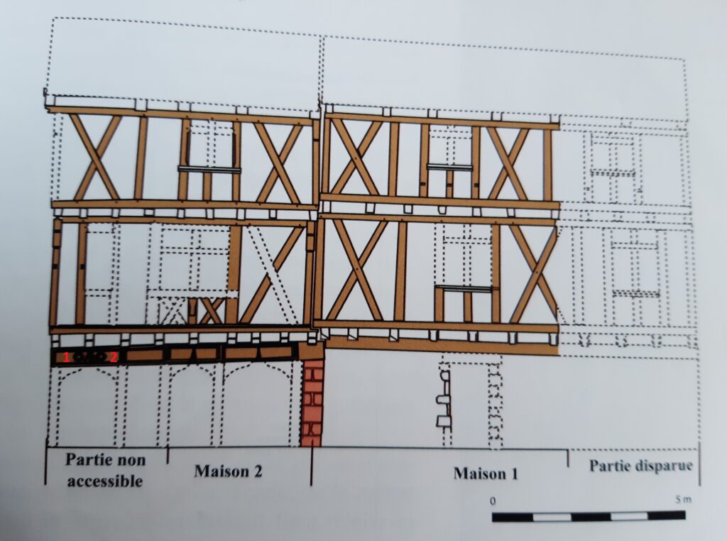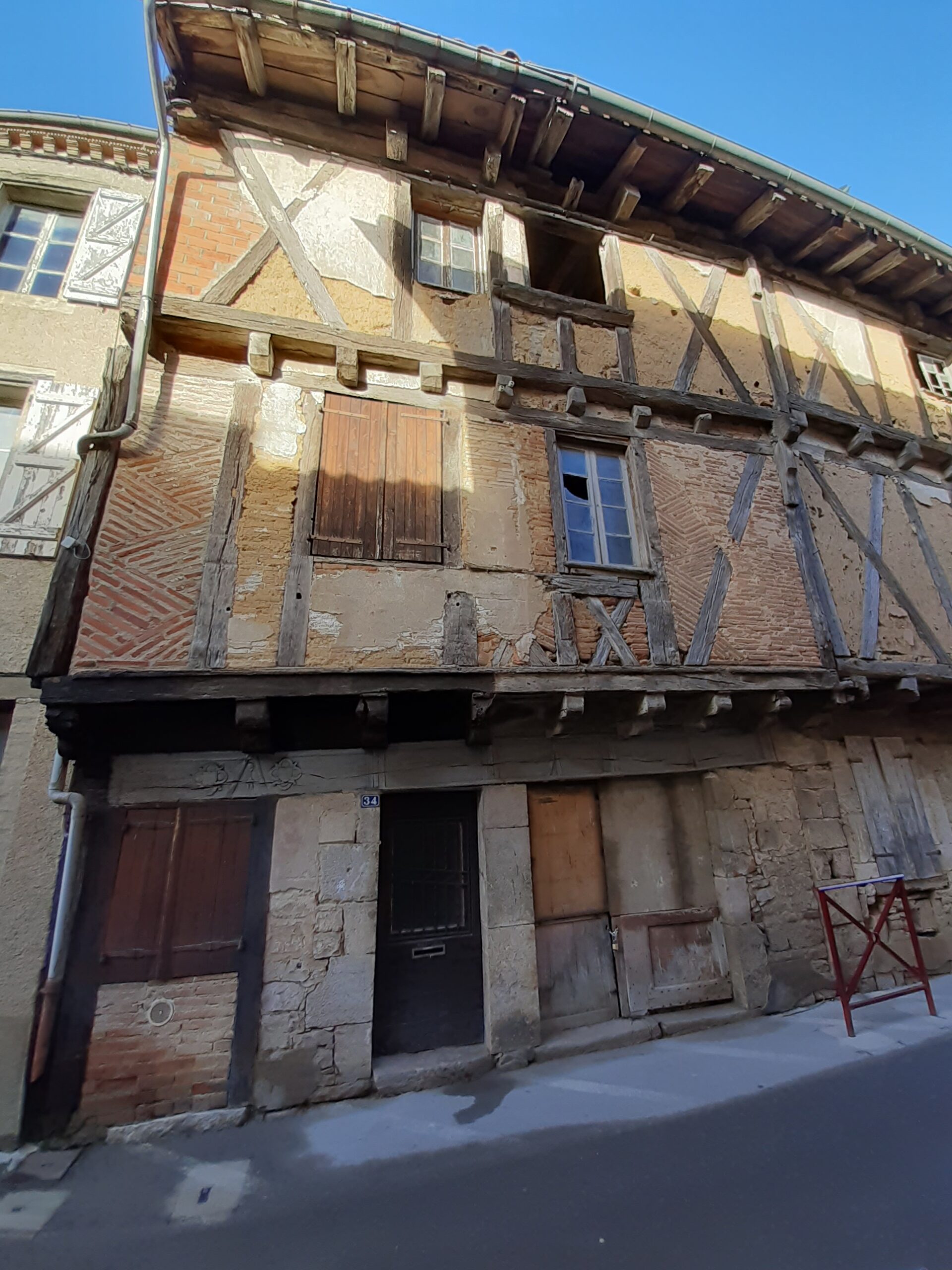 Témoin de l’important développement que Montricoux connaît durant le XVe siècle, à la suite de la guerre de Cent Ans, avec la création d’un faubourg ou barry qui s’étend au nord-est des remparts, cette maison présente une importante façade sur rue (plus de 10 mètres de long), avec deux niveaux supérieurs en encorbellement en pan de bois, rythmés par de grandes croix de saint André. Un mur en pierre, au nord, soutient l’élévation jusqu’au premier étage et sert de support à des équipements domestiques (placards, évier, baies). Le rez-de-chaussée s’ouvrait sur la rue successivement grâce à une porte principale, une baie puis une seconde porte, toutes les trois terminées en accolade (ibid., p. 24-30). La poutre sablière, qui porte les abouts de solives du premier étage, est sculptée d’un décor de cadre sur toute sa longueur. Au-dessus de la porte principale, de part et d’autre de l’accolade, deux écus sont inscrits dans un quadrilobe gothique (armoiries 1-2), désormais dépourvus de toute trace d’armoiries, probablement peintes, qu’ils portaient à l’origine. Dans la pointe d’accolade qui les sépare nous remarquons la présence d’un motif sculpté qui, parfois identifié comme un outil, pourrait être la partie supérieure d’une épée, avec son pommeau facetté, sa poignée, sa garde dont les quillons sont absents et la partie supérieure de la lame avec une gorge centrale.