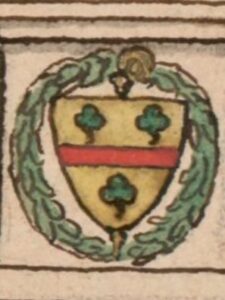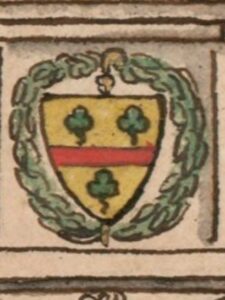 Mi-parti : au 1, d’or à la fasce de gueules, accompagnée de trois trèfles de sinople (Du Prat), au 2, d’or à une fleur de lys d’azur accompagnée de deux dauphins de sable en chef (Veyny d’Arbouze ?).