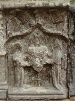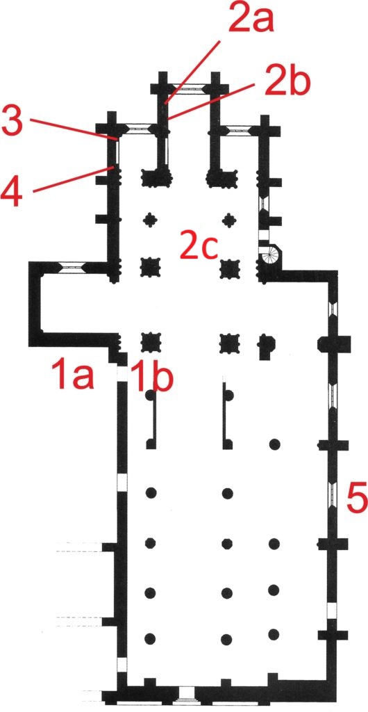 Au chevet, la chapelle absidale, très endommagée, est percée d’un enfeu au nord, abritant la façade armoriée d’un tombeau. De l’enfeu, il ne reste qu’un arrachement à vif, de sorte qu’il est impossible de déterminer s’il fut percé d’origine, ou s’il résulte d’une redisposition. Scellé dans l’épaisseur du mur, le bas-relief armorié en kersanton (2,60 m par 0,65 m) est sculpté de cinq pilastres délimitant quatre arcades, sous lesquelles un priant présenté par son saint patron à une Vierge à l’Enfant est encadré d’armoiries (Castel 1995, p. 245) (armoiries 2a-b). Ce relief aurait l’apparence d’être le soubassement du tombeau abrité sous l’enfeu, s’il n’était le témoignage de Potier de Courcy qui signalait « parmi les ruines […] un autel en kersanton » dont la description concordante ne laisse aucune place au doute (Potier 1859, p. 402-403). Le scellement grossier du relief, son rehaussement approximatif, le raccord incertain aux maçonneries coincées de pierres de calage sont les indices d’un remontage moderne destiné à préserver et présenter sous l’enfeu un ensemble lapidaire dispersé, appartenant à un tombeau démembré. Il faut sans doute y reconnaître un autre bas-relief armorié conservé au musée voisin, de facture similaire et orné des mêmes armes, qui aurait pu former un petit côté. Les armoiries sont à l’abbé Guillaume de Kerlec’h († vers 1470), abbé en 1430 (Levot 1873, p. 365 ; Torchet 2010, p. 214), dont la famille blasonnaitfascé d’or et de gueules de six pièces, au lambel à trois pendants d’azur brochant (Potier de Courcy 1993, p. 104) (armoiries2a-b). Le relief pourrait cependant ne pas s’être rapporté au tombeau de Guillaume de Kerlec’h lui-même, mais à l’un de deux abbés homonymes du XIVe siècle, ses ancêtres, dans l’éventualité improbable, mais qui ne saurait être écartée, d’une commande mémorielle pour leurs tombeaux. La sépulture de l’un de ces abbés était attestée sous la première arcade du chœur au sud (voir ci-après).