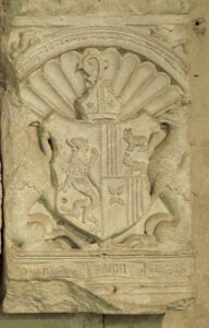 Le roi François Ier et le comte de Foix occupent, respectivement, le deuxième et le troisième panneau. Le souverain porte une cape et un tabard fleurdelisés et il est coiffé d’un chapeau. Dans sa main droite il brandit un bâton de commandement. Le comte de Foix porte lui aussi un surcot armorié, sur lequel nous ne distinguons qu’un quartier barré à la bordure. Un écusson armorié était sculpté dans la bordure supérieure du panneau (armoirie 2). Il n’en reste aujourd’hui que la moitié inférieure, puisqu’il a été sans doute endommagé au moment du remploi de la pièce (il est plausible que d’autres armoiries figuraient dans la partie supérieure de chaque volet de la frise). Nous pouvons tout de même y reconnaître l’écartelé Foix-Béarn. Le cavalier pourrait donc être identifié avec Henri II, roi de Navarre, qui portait le titre de comte de Foix depuis 1517. Mari de Marguerite d’Angoulême, sœur aînée de François Ier, il était parmi les vassaux les plus puissants du roi et fier opposant de son principal ministre, Anne de Montmorency (Reid 2011).