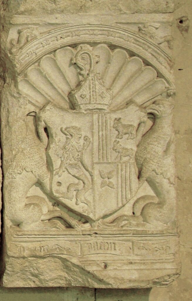 Celui-ci semble en effet à reconnaître dans le personnage identifié par l’armoirie qui occupe totalement le panneau de droite, reproduite sur un écu en targe timbré d’une crosse et d’une mitre, insignes de fonction d’un évêque (armoirie 4). Avec Alexandre de Marsy (1866, p. 12) nous y reconnaissons les armes de Foucauld de Bonneval (avant 1487-1540) qui occupe le siège épiscopal de Soissons en 1514-1528. Il est plausible que sa devise figurait dans le cartouche sculpté dans la marge inférieure du panneau : « [inquire] pacem » (Ancien 1965, p. 140). Fils d’Antoine de Bonneval (1440-1505), gouverneur du Roussillon et du Limousin, et de Marguerite de Foix (v. 1455-après 1487), fille de Mathieu de Foix – comte de Comminges et lui-même quatrième fils d’Archambaud de Grailly – et de Catherine de Coarraze, Antoine associe ici les armes de ses parents tout en gardant les supports de sa famille paternelle, les griffons. Nous noterons que la famille de Foix est très liée à François Ier qui fit de Françoise de Foix (v. 1495-1537) l’une de ses favorites. Françoise qui intervient beaucoup auprès du roi en faveur de ses frères, notamment Odet de Lautrec (1485-1528), est donc une cousine éloignée de Foucauld de Bonneval.
