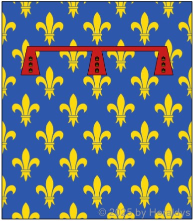 Charenton-le-Pont, château de Conflans. Armoirie Artois (armoirie 1) (D’azur semé de fleurs de lys d’or au lambel de gueules chaque pendant chargé de trois châteaux d’or). Attribution : Artois Robert II d' Position : Intérieur Pièce / Partie de l'édifice : Galerie Emplacement précis : Mur Support armorié : Mur Structure actuelle de conservation : Pièce disparue Technique : Peinture murale Période : 1301-1325 Dans le monument : Charenton-le-Pont, château de Conflans