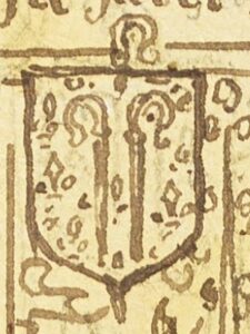 Paris, couvent des Célestins (église, tombeaux). Armoirie évêché de Noyon (armoirie 13a) D'(azur) semé de fleurs de lys d'(or), à deux crosses d'(argent) adossées, brochant sur le tout. Attribution : Évêché de Noyon Timbre : Une crosse épiscopale/d'abbé Position : Intérieur Pièce / Partie de l'édifice : Chœur Emplacement précis : Sol ; Sépulture Support armorié : Plate-tombe Structure actuelle de conservation : Pièce disparue Technique : Relief en cuivre Période : 1401-1425 Dans le monument : Paris, couvent des Célestins (église, tombeaux)