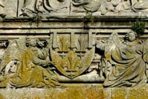 Amboise, château d’Amboise (tour des Minimes). Armoirie Orléans (armoirie 3a) D'(azur) à trois fleurs de lys d'(or), au lambel d’(argent). Attribution : Armoirie restaurée ; Orléans familleTenants / Supports : Deux marmousets Position : Intérieur Pièce / Partie de l'édifice : Tour Emplacement précis : Voûte Support armorié : Cul-de-lampe (culot) Structure actuelle de conservation : In situ Technique : Sculpture en pierre Période : 1801-1900 Dans le monument : Amboise, château (tour des Minimes)