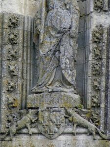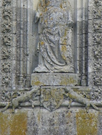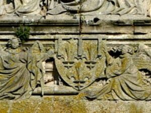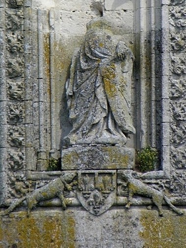 La Ferté-Milon, château. Armoirie d’Orléans (armoirie 1a) D'(azur) à trois fleurs de lys d'(or), au lambel d'(argent). Attribution : Orléans Louis Ier de ; Orléans familleTenants / Supports : Deux anges Position : Extérieur Pièce / Partie de l'édifice : Façade ; Portail Emplacement précis : Niche Support armorié : Cadre Structure actuelle de conservation : In situ Technique : Relief en pierre Période : 1401-1425 Dans le monument : La Ferté-Milon, château