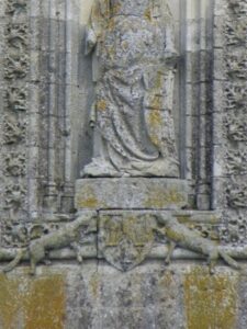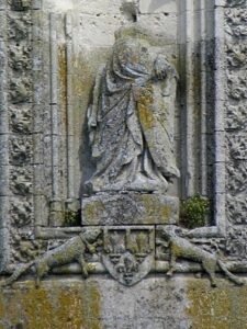 La Ferté-Milon, château. Armoirie d’Orléans (armoirie 1b) D'(azur) à trois fleurs de lys d'(or), au lambel d'(argent). Attribution : Orléans Jean de ; Orléans familleTenants / Supports : Deux anges Position : Extérieur Pièce / Partie de l'édifice : Façade ; Portail Emplacement précis : Niche Support armorié : Cadre Technique : Relief en pierre Période : 1401-1425 Dans le monument : La Ferté-Milon, château
