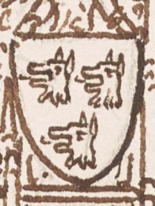 (Écartelé, au 1 et 4 d’azur à trois fleurs de lys d’or ; au 2 et 3 de gueules à trois léopards d’or armés et lampassés d’azur, au lambel à cinq pendants brochant sur l’écartelé, les deux pendants dextres d’argent chargés de trois mouchetures d’hermine, les trois senestres d’azur chargés de trois fleurs de lys d’or).