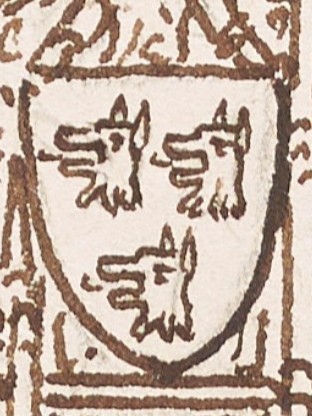 (Parti, au 1 Écartelé, au 1 et 4 d’azur à trois fleurs de lys d’or ; au 2 et 3 de gueules à trois léopards d’or armés et lampassés d’azur, au lambel à cinq pendants brochant sur l’écartelé, les deux pendants dextres d’argent chargés de trois mouchetures d’hermine, les trois senestres d’azur chargés de trois fleurs de lys d’or (Lancastre) ; au 2 écartelé, au 1 et 4 d’azur semé de fleurs de lys d’or à la bordure componée d’argent et de gueules (Touraine), au 2 et 3 bandé d’or et d’azur, à la bordure de gueules (Bourgogne) sur le tout d’or, au lion de sable, armé et lampassé de gueules (Flandre)).