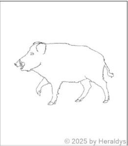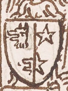 Cimier : Une tête de loup (?) hissant d’un croissant herminé.