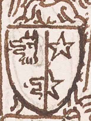 Écartelé : aux 1 et 4, d’or à trois fasces ondées de gueules ; aux 2 et 3, palé d’or et de gueules de six pièces (Amboise ?) ; sur le tout d’or au dauphin d’azur (Dauphiné d’Auvergne ?).