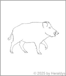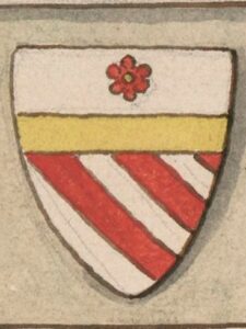 Cimier : Un chapeau de tournoi de gueules retroussé d’or, orné par devant d’un élément en forme de pince de crabe de gueules, bordé d’or, chargé de deux roses d’argent.