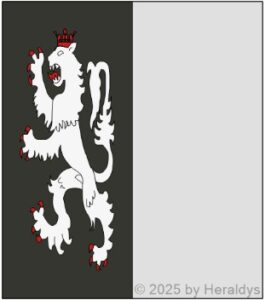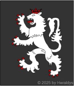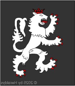 Parti : au 1 de … à trois coquilles de … posées 2 et 1 et accompagnées d’un croissant de … en chef ; au 2, d’hermine au croissant de … en chef, au chef émanché de …