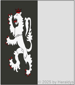 (Mi-parti, au 1 : d’or au lion d’azur chargé sur l’épaule d’une tour d’argent portée sur une demi-roue de même ; au 2 : fascé d’or et de gueules de six pièces)