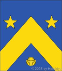 (D’azur au chevron d’or, accompagné de deux étoiles du même en chef et d’une coquille du même en pointe).