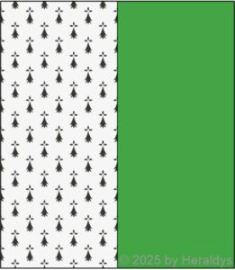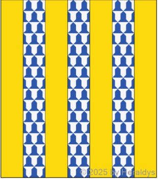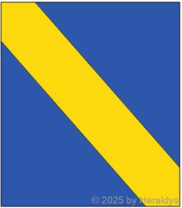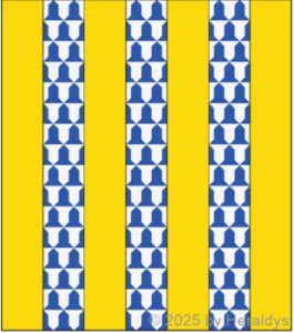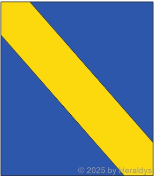 (Fascé d’or et d’azur de 6 pièces, au chef tiercé en pal : au 1 tranché d’or et d’azur, au 2 palé d’or et d’azur, au 3 taillé d’or et d’azur ; à un écusson d’argent à la bande de gueules posé en cœur).