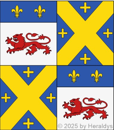 (Écartelé : aux 1 et 4, d’argent au lion passant de gueules, au chef d’azur chargé de deux fleurs de lis d’or ; aux 2 et 3, d’azur au sautoir d’or cantonné de quatre croisettes de même).