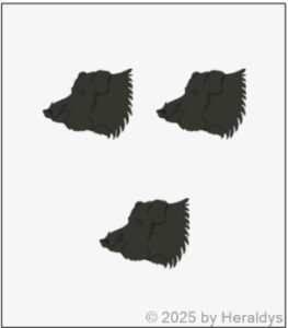 (De gueules à la tête de licorne arrachée d’argent, accompagnée de deux roses d’argent en chef et d’une étoile du même en pointe).